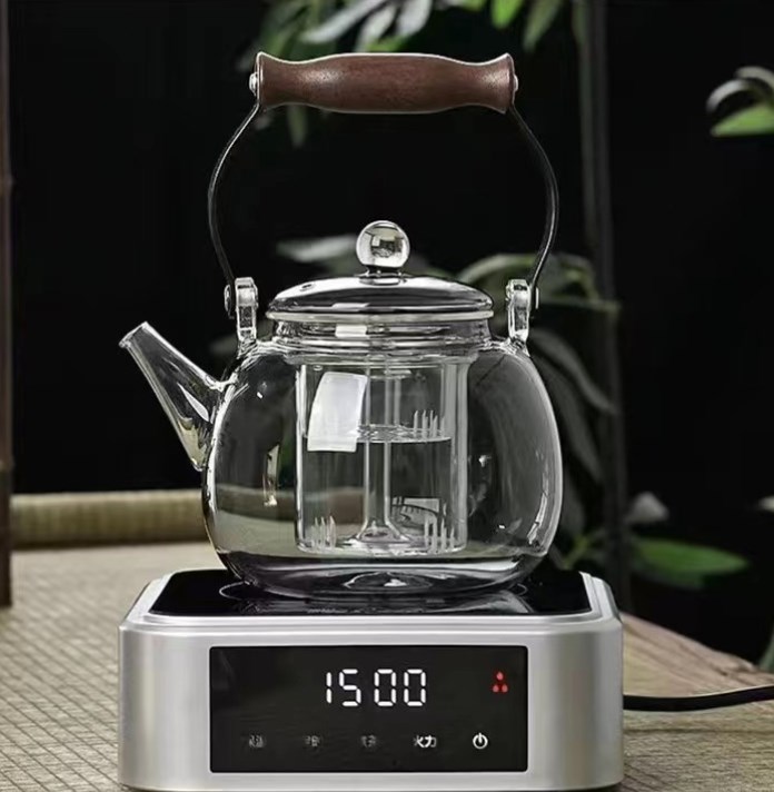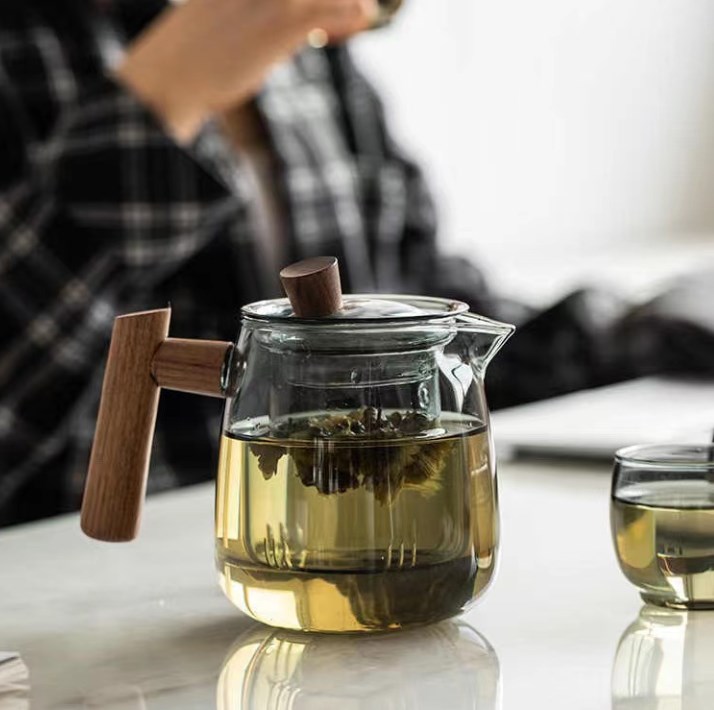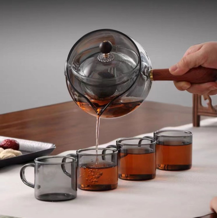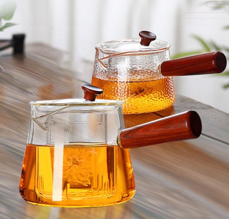 高硼硅玻璃木把煮茶壶烟榭泡茶壶电陶炉侧把壶花草壶透黑玻璃茶壶