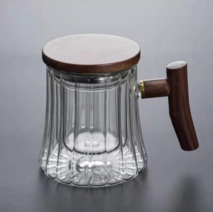 高硼硅玻璃三件杯胡桃木盖泡茶杯办公室家用带过滤泡茶水杯竖纹玻