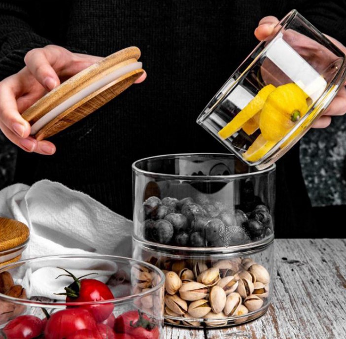 高硼硅玻璃多层竹盖叠加杂粮组合收纳储物罐水果蔬菜创意沙拉碗
