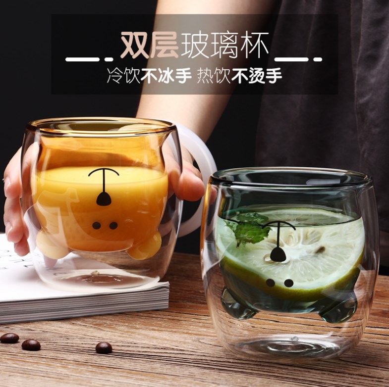 创意卡通双层髙硼硅玻璃杯马克杯鸭子杯小熊杯牛奶杯家用水杯