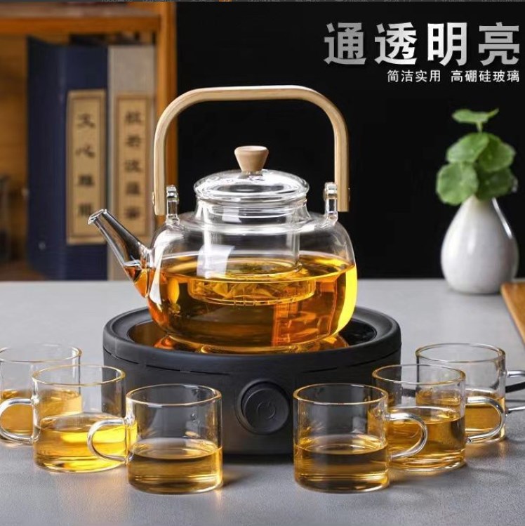 莲花提梁煮茶壶高硼硅透黑玻璃茶壶木把提梁壶带过滤茶水分离茶壶