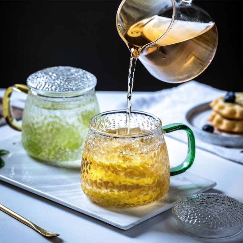 日式锤纹玻璃杯带把带盖ins风家用简约茶杯带把手柄茶水分 离杯子